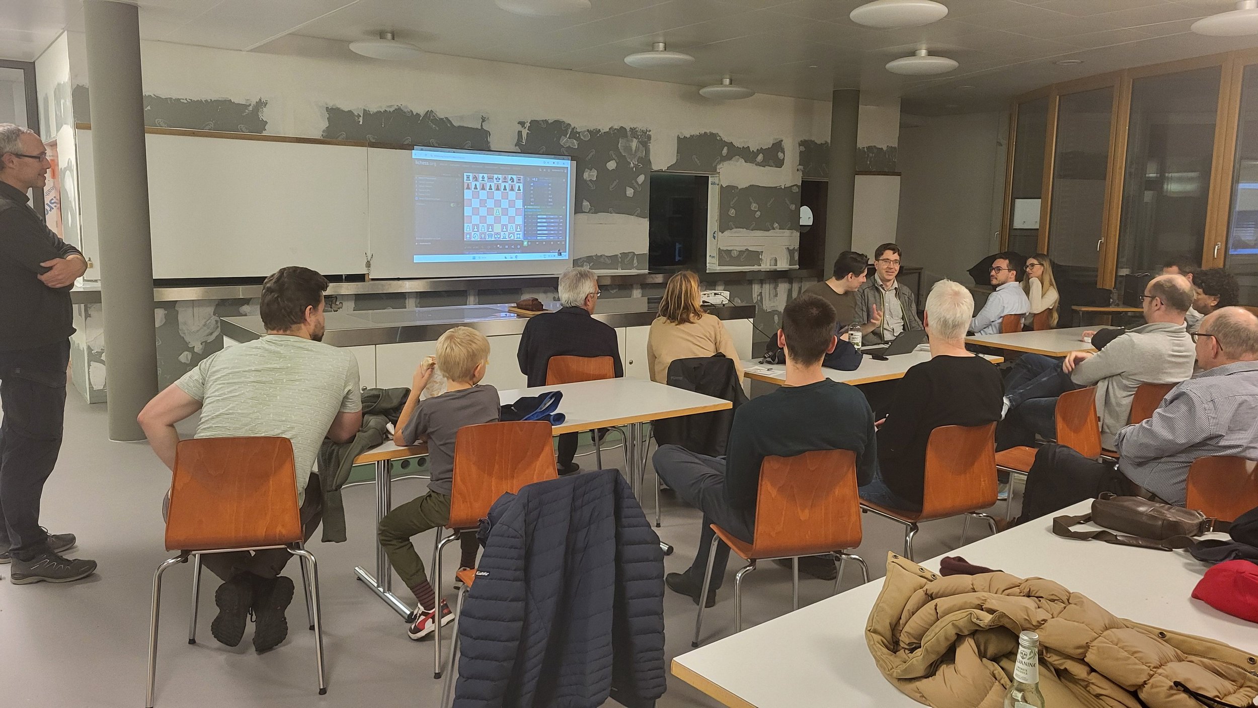 This monday’s training had a large public, as we were analysing some of our SMM NLB games from the weekend. They were prepared and presented by our usual trainer Miran. There were good discussions on the content, and Felix’s wild attacking game impressed the audience.